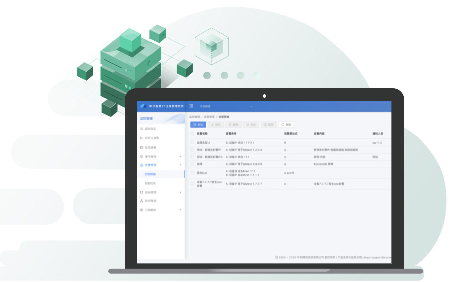 With alarm management and customized monitoring alarm strategies, it can set alarm conditions and alarm contents, customize users for alarms and other notifications and different notification methods (mails/WebHook)